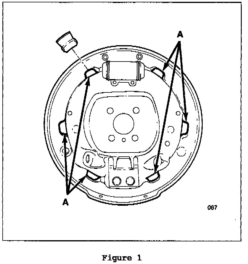 This repair procedure involves installation of six brake shoe silencer pads - per backing plate in locations (A) (Figure 1).