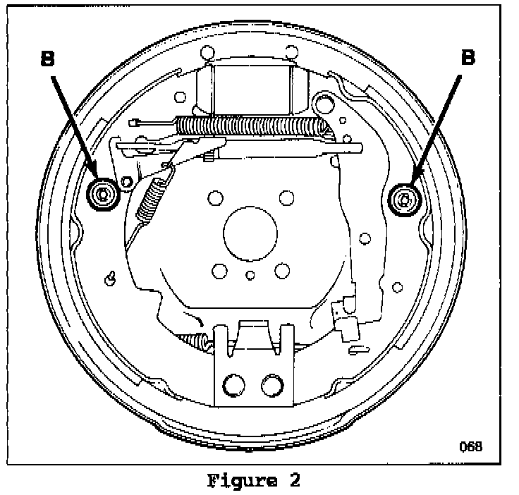 3. Remove brake shoe holddown springs (B) (Figure 2). Allow the brake shoes to move away from the backing plate to gain clearance for cleaning and silencer pad installation.