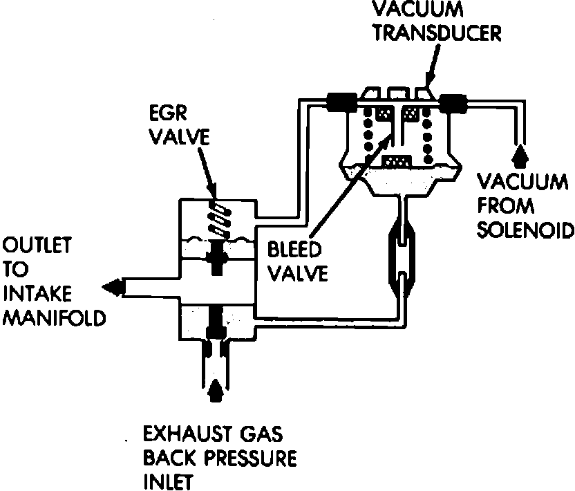 When the EGR solenoid is de-energized by the ECU (no voltage applied), engine vacuum flows through the EGR valve solenoid to the vacuum transducer through a connecting hose. The transducer is connected to the engine exhaust system by a small hose that connects to the base of the EGR valve. This hose is used to sense exhaust manifold back pressure. When the EGR solenoid is not energized and the engine back pressure entering the EGR inlet is strong enough to close the transducer bleed valve, vacuum will be supplied to the EGR valve and EGR operation will begin. If back pressure is not strong enough to close the transducer bleed valve, the transducer will bleed off the vacuum preventing EGR operation.
