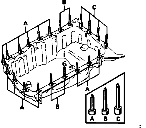 b. Three different length oil pan attaching bolts (A, B, C) are used.