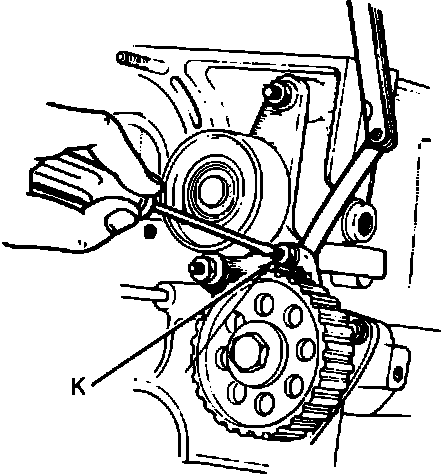 Prior to timing belt installation, intermediate shaft cover to timing belt tensioner clearance should be checked to prevent movement of timing belt during tensioning. Using a suitable feeler gauge measure clearance. Clearance should be .004 inch. If necessary adjust by turning adjusting screw (K), Fig. 10.