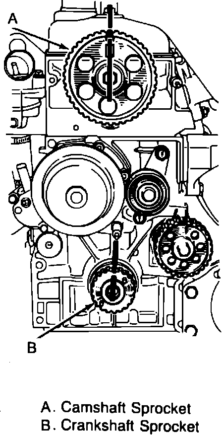 4. Install timing belt over sprockets, then loosen timing belt tensioner bolts. The timing belt should be tight at positions A and B, Fig. 13.