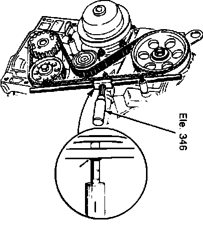 e. Check timing belt tension using tool Ele. 346 or equivalent, Fig. 14. Timing belt deflection should be .216 to .276 inch.