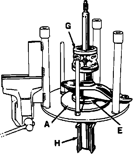 e. Position strut (H) into adapter plates (A) and (E). Position jounce bumper (G).
