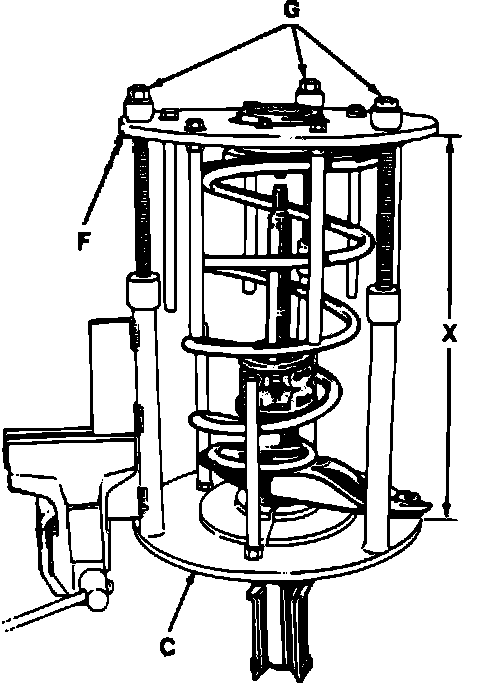 g. Using the threaded rods (G), slowly compress upper plate (F) until dimension X is 15.70 inches. Ensure upper portion of the coil spring is located in the stop on the spring retainer.