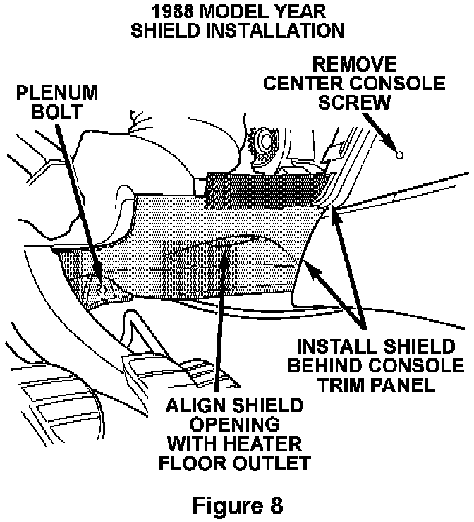 6. Install the splash shield as shown in Figure 8. Make sure that the shield is behind the center console and that the shield opening aligns with the heater outlet.