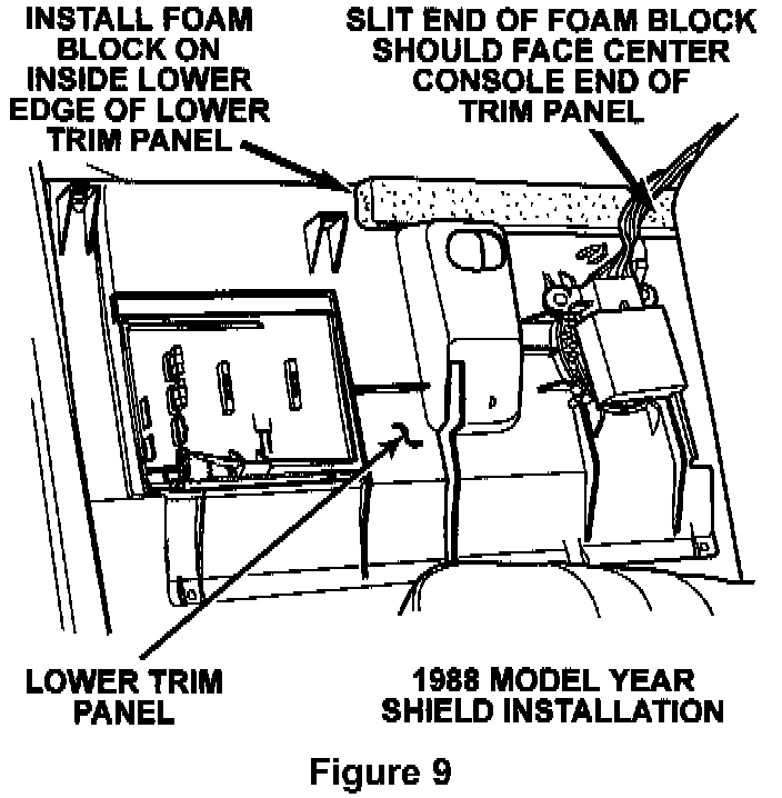 8. Install the provided foam block on to the lower trim panel with the slit toward the center console end (Figure 9).