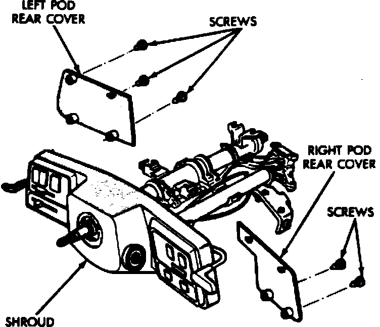 5. Remove shroud bracket, then the two ignition switch retaining screws and switch from key/lock cylinder housing. Turn ignition key to unmarked position, push the cylinder lock tab inward and remove.