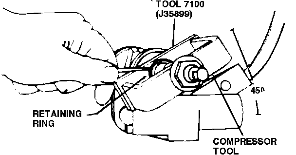 7. On all models, position a new snap ring, then using adapter tool No. J-35899 and compressor tool No. J-23653-A or equivalents, compress retainer spring as outlined under "Disassembly."