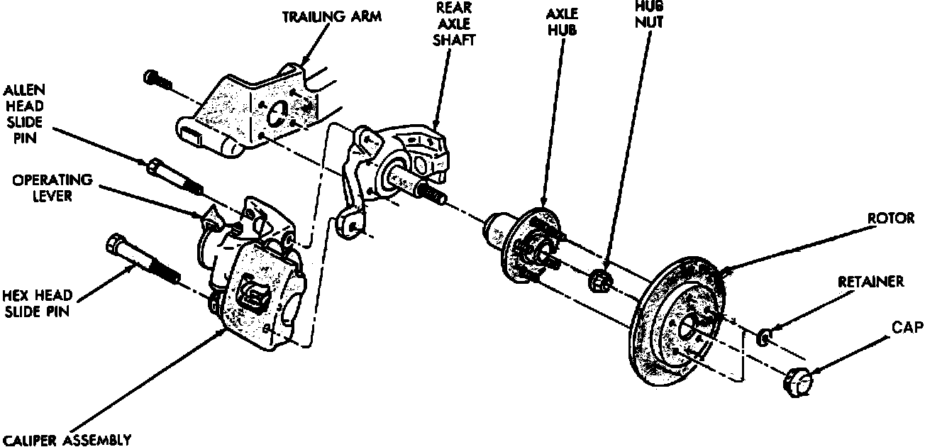 The rear caliper is mounted on the rear axle spindle/brake adaptor which is attached to the rear trailing arm (Fig. 2). The rotor is mounted on the axle hub. Two slide pins are used to secure the caliper to the axle spindle/brake adaptor.