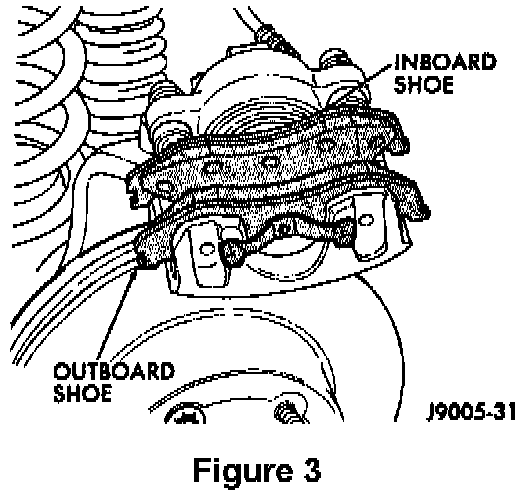 5. Set the caliper aside (Figure 3). Secure the caliper to the suspension with a wire. Do not allow the brake hose to support the weight of the caliper.