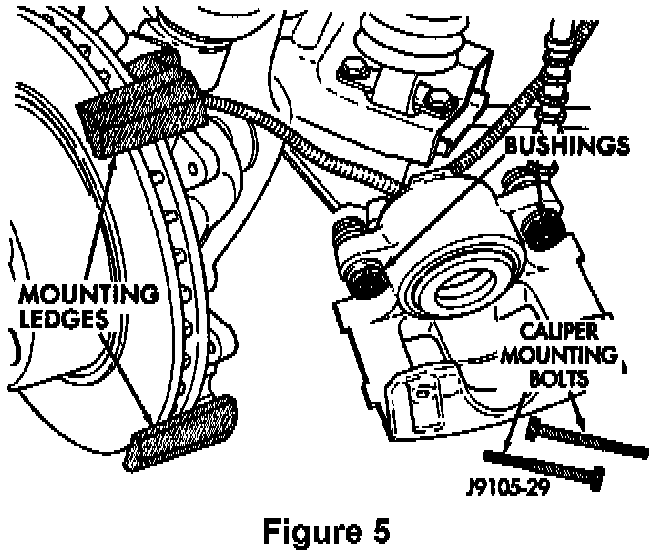11. Install the caliper assembly (Figure 5). Position the mounting notches at the lower end of the brake shoes on the bottom mounting ledge and then rotate the caliper over the rotor and seat the notches at the upper end of the shoes on the mounting ledge.