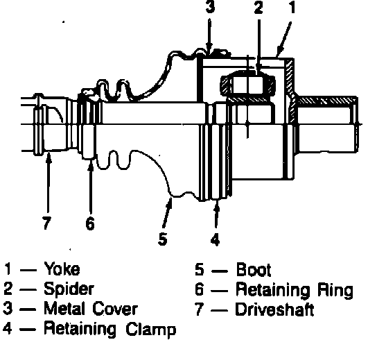 5. Remove boot from shaft. Inspect C/V joint housing, boot, plastic retaining ring, tripod and tripod bearings. Replace worn or damaged components.