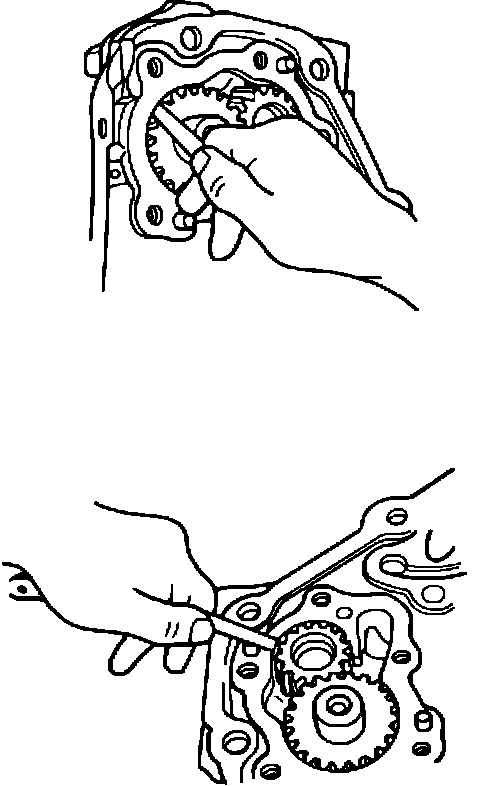 Attached are two identical illustrations showing the proper position to be used when measuring oil pump rotor drive gear clearances. Also attached are two identical illustrations showing the proper position to be used when measuring oil pump driven gear clearance.