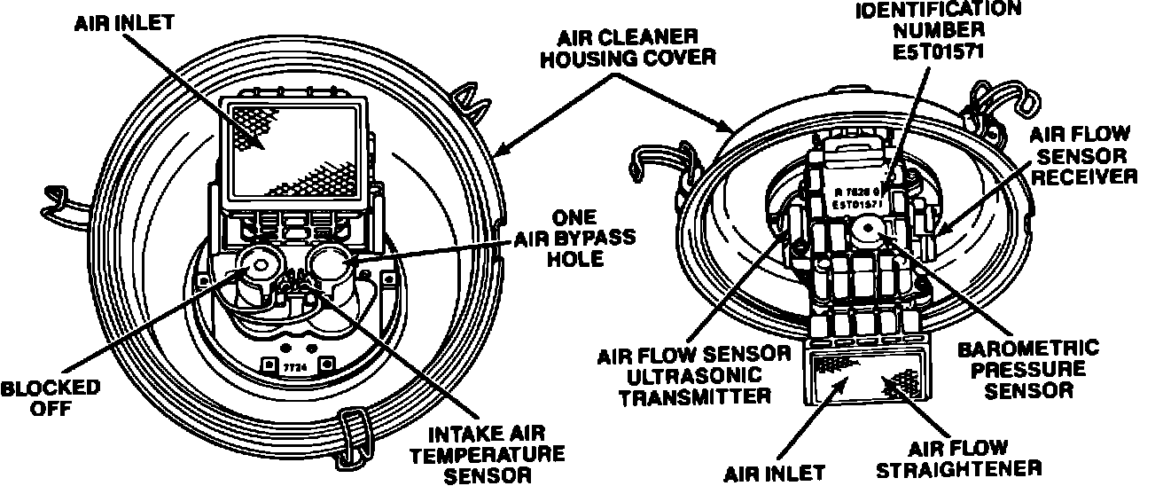 1. Confirm the air flow sensor identification number (E5T01571) as marked on the side of the air flow sensor (Figure 1). Inspect the air passage of the sensor and verify that one of the air by-pass holes is plugged. If both of the by-pass holes are open, the air flow sensor must be replaced using the correct sensor, PN MD118125.