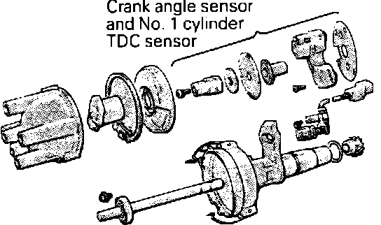 The Crank Angle Sensor and the Top Dead Center Sensor are located within the distributor housing. These sensors are incorporated into one unit, and consist of a disc and a pick-up unit. The disc is affixed to the distributor shaft and the light-transmitting unit is mounted stationary to the distributor housing.