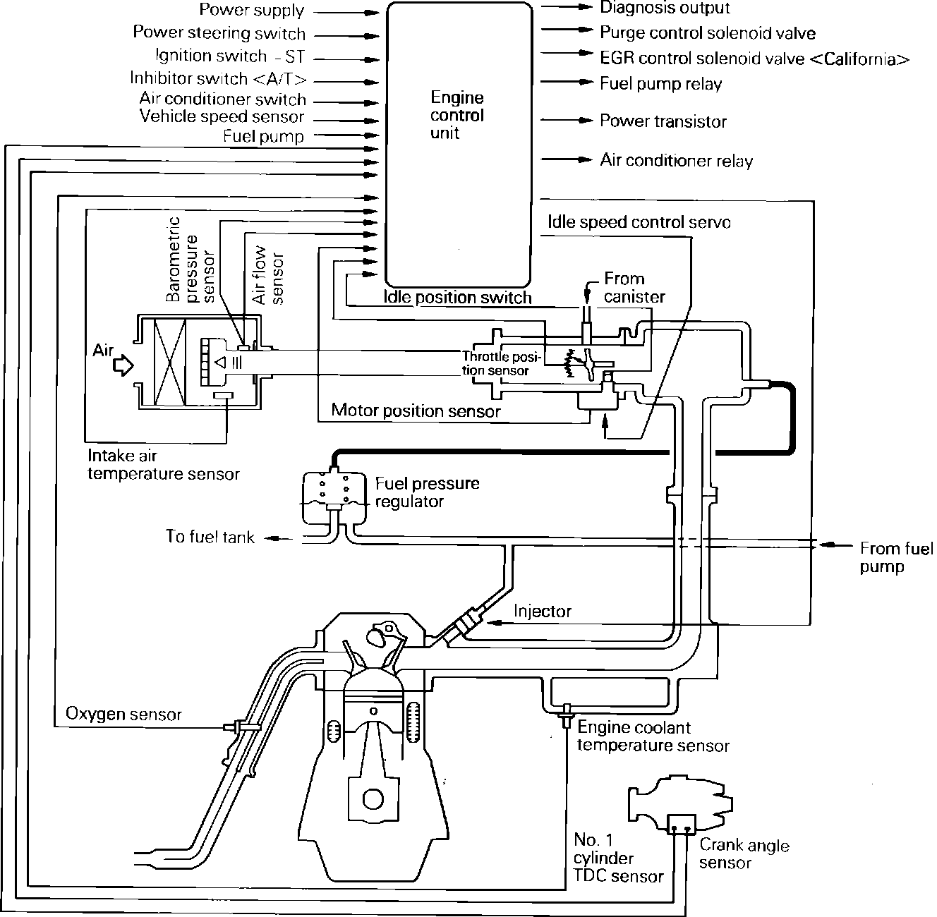 The Fuel Injection Control System consists of the ECU (Electronic Control Unit) and all of the engine and operating condition sensors. Using the information from the sensors to determine the proper fuel amount and delivery time, the ECU varies the injectors "ON" time to adjust the amount of fuel delivered during each individual firing cycle. The ECU also controls the MODE of operation. In normal operating MODE, the ECU activates the injectors in a sequential order, synchronous to the firing order. In cold start MODE, the ECU commands the injectors to operate in a non-synchronous pattern (simultaneously activates all injectors on each cylinder pulse) to enrich the air/fuel ratio and promote cold condition vaporization. In acceleration MODE, an additional injection of fuel is provided for the first two cylinders immediately following the ECU sensing an acceleration condition. The additional injection pulses continue as long as the ECU senses an increasing acceleration condition.