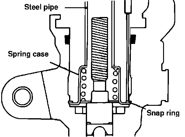 5. Compress spring case into caliper body using a 3/4 inch steel pipe as shown, then remove snap ring using suitable snap ring pliers.