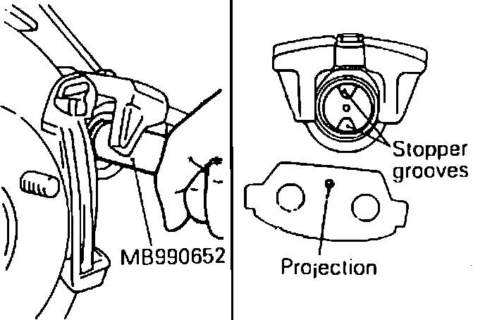 6. Using piston driver MB990652 or equivalent, thread caliper piston into bore and ensure that piston stopper grooves are aligned as shown, so that they will interlock with projections on pad assembly.