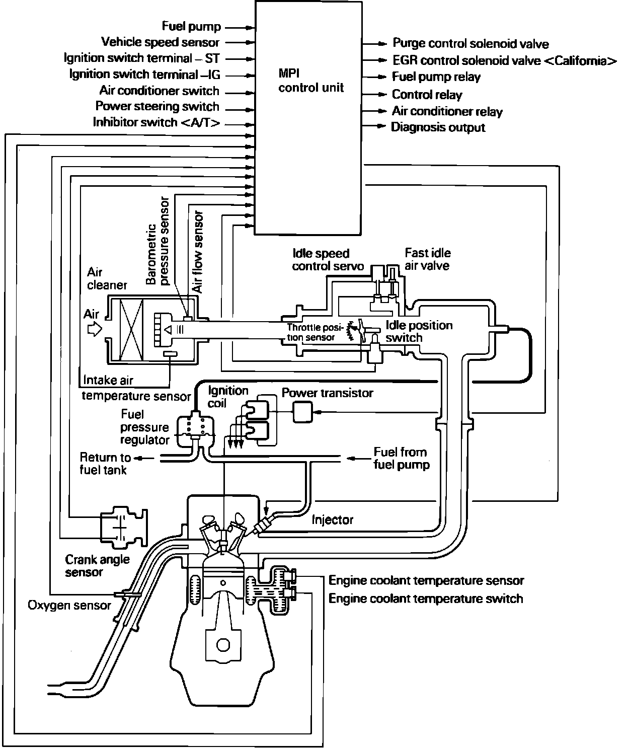 The Fuel Injection Control System consists of the ECU (Electronic Control Unit) and all of the engine and operating condition sensors. Using the information from the sensors to determine the proper fuel amount and delivery time, the ECU varies the injectors "ON" time to adjust the amount of fuel delivered during each individual firing cycle. The ECU also controls the MODE of operation. In normal operating MODE, the ECU activates the injectors in a sequential order, synchronous to the firing order. In cold start MODE, the ECU commands the injectors to operate in a non-synchronous pattern (simultaneously activates all injectors on each cylinder pulse) to enrich the air/fuel ratio and promote cold condition vaporization. In acceleration MODE, an additional injection of fuel is provided for the first two cylinders immediately following the ECU sensing an acceleration condition. The additional injection pulses continue as long as the ECU senses an increasing acceleration condition.