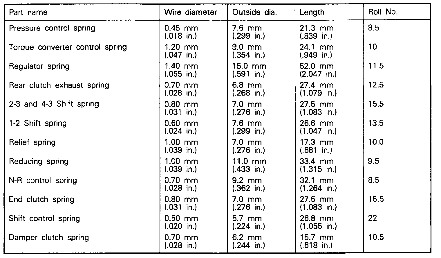 Valve Body Spring Identification Chart: