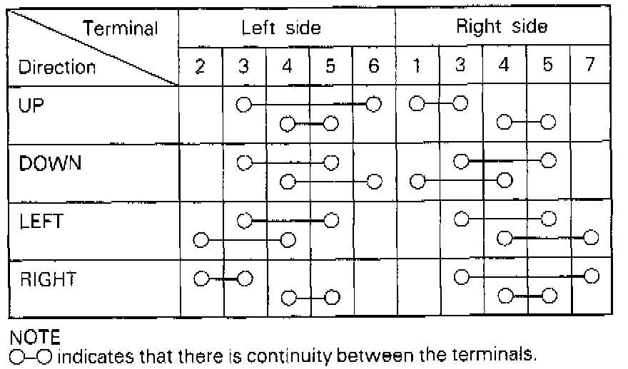 Operate switches and check the continuity between terminals. Refer to the chart below.