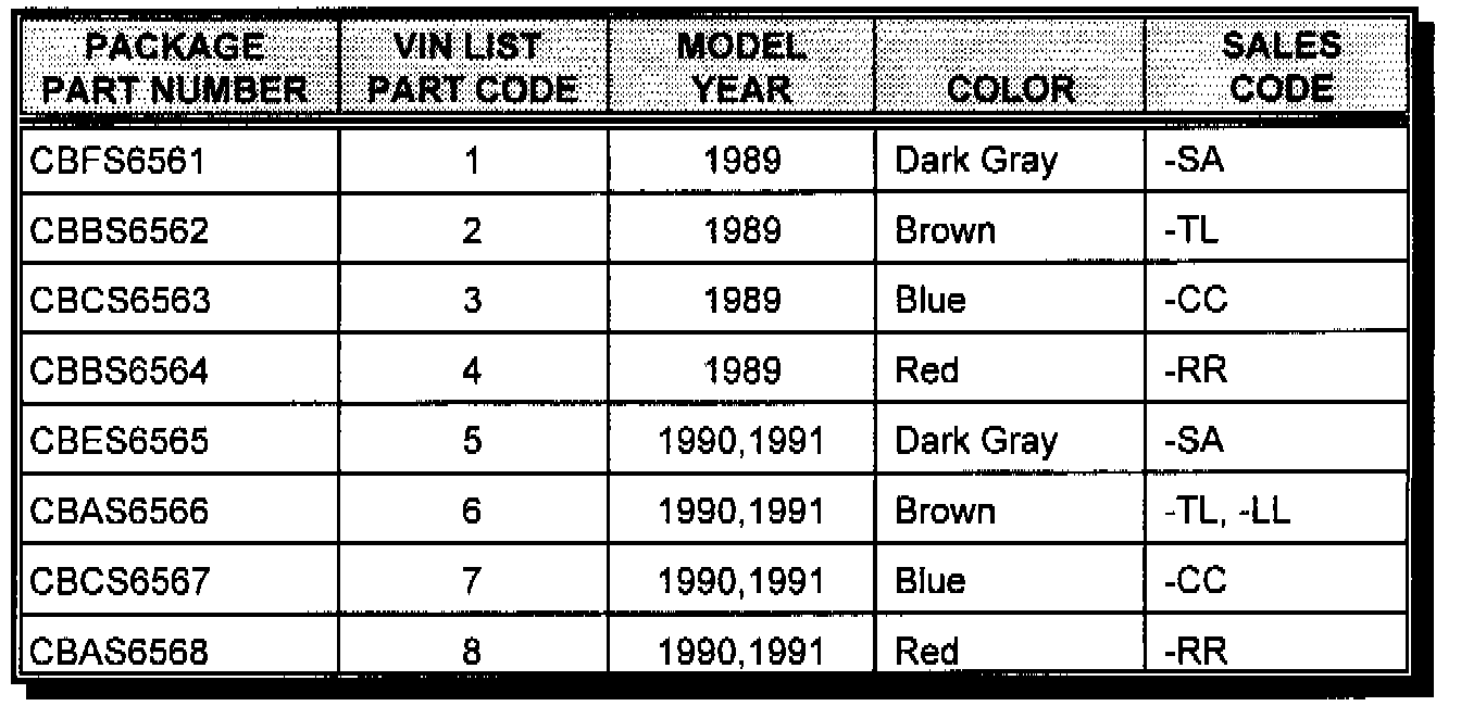 Eight (8) part packages are required depending upon the model year of the vehicle and the color of the vehicle interior. The Vehicle VIN List provided to each involved dealer includes a part code which identifies the required part number package for each VIN. This code is located in the third column of the VIN list and is identified by the "P" column header. Use the table to identify the correct part package for the vehicle being serviced.