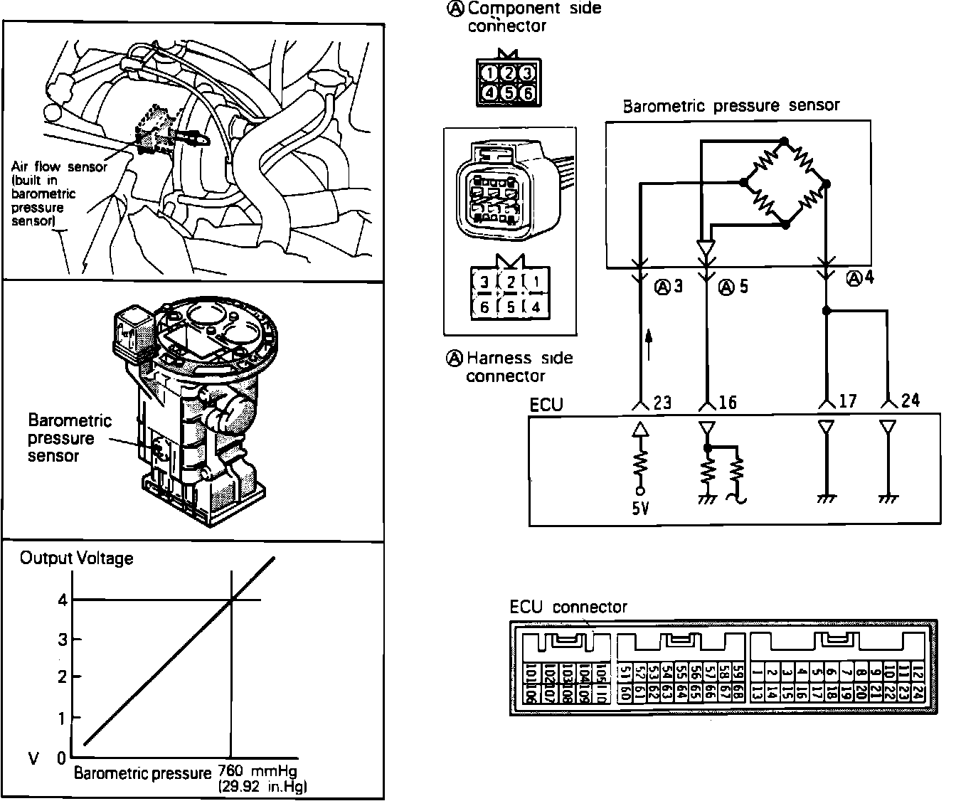 To test the Barometric Pressure Sensor, located on the air flow sensor, in the air cleaner housing, proceed as follows.
