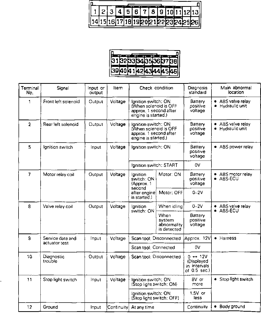 2. With the ABS ECU connector connected, check voltage and continuity between each terminal and ground when ignition is the On position as shown.