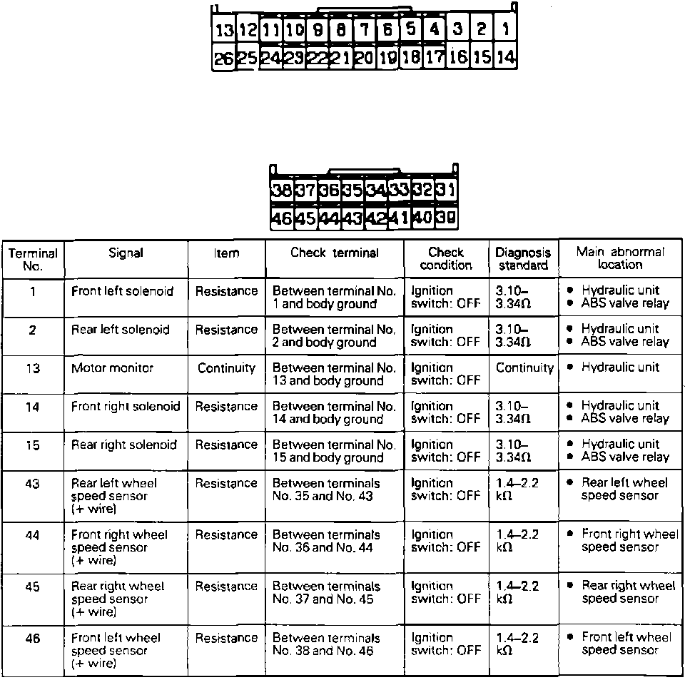 3. With the ABS ECU connector disconnected, check resistance and continuity between each terminal on the harness side of the connector as shown.