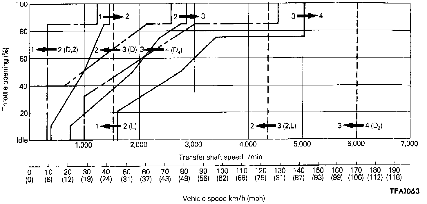 Two shift patterns are pre-stored in the control module of this transaxle. One is the power pattern (for more powerful performance), and the other is the economy pattern (for improved fuel consumption and quieter operation).