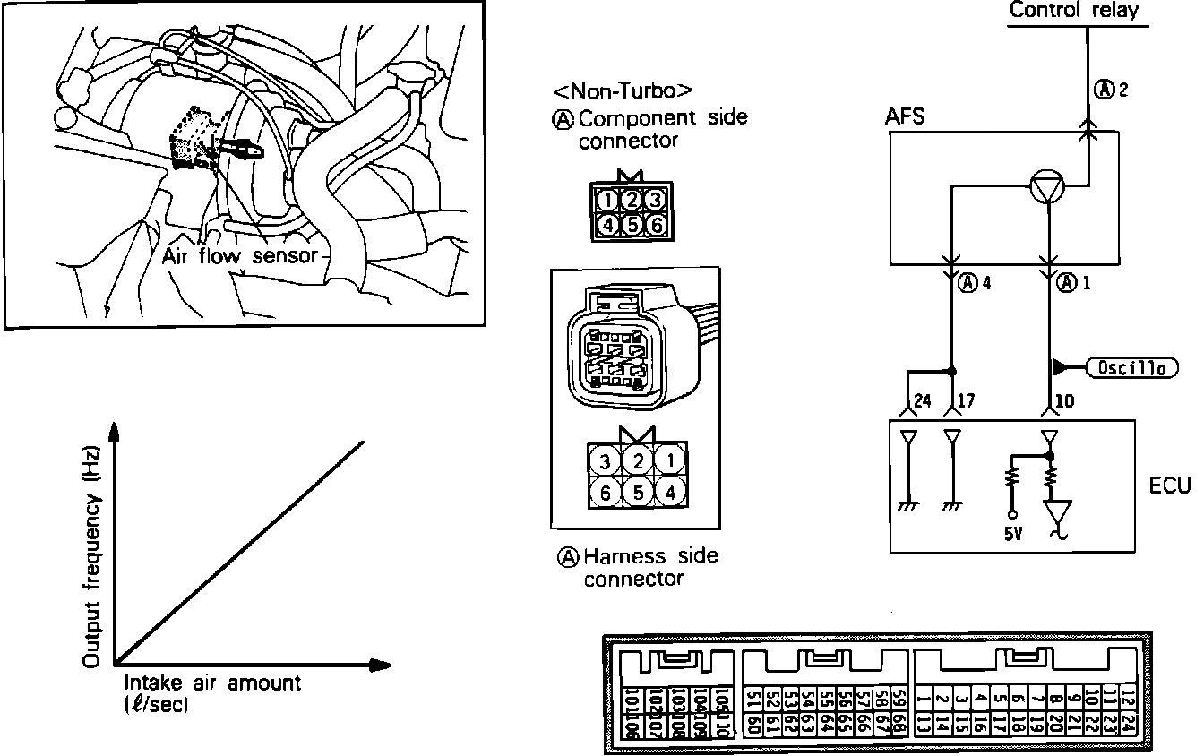 1. Warm engine. Coolant temperature should be at: 85-95°C (185-205°F), with no electrical accessory loads on. Connect a Frequency counter (HERTZ counter) between terminal 4 and 1 (do not remove the connector, instead insert a straight pin or needle from the back side of the connector) of the Air Flow Sensor (AFS) connector.