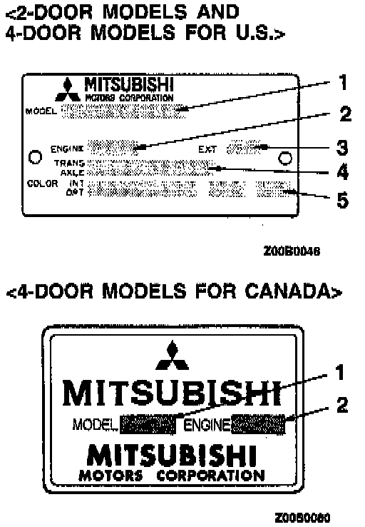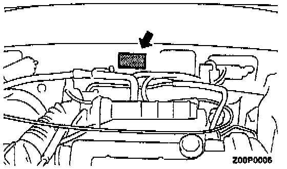 Vehicle information code plate is riveted onto the bulkhead in the engine component. The plate shows model code, engine model, transaxle model, and body color code.