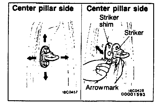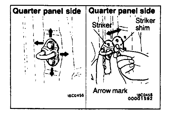 If the door opening and closing is stiff, adjust the linking of the striker and the door latch using the shim, while moving the striker up and down, or left and right.