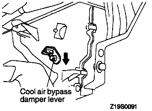 3. Turn the cool air bypass damper lever at the heater unit side fully downward (in the direction of the arrow), and install the cool air bypass lever cable