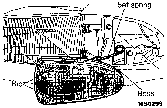 2. While pressing in the front turn signal light towards the rear of the vehicle, hook the set spring to the tender shield inner to secure the front turn signal light to the vehicle body.
