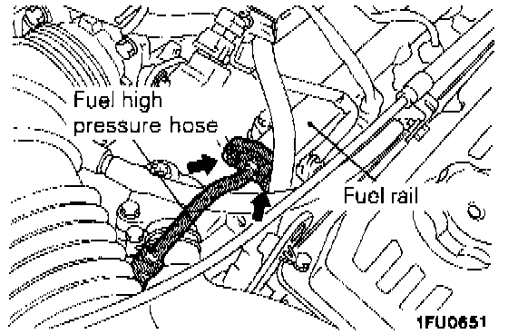 1. Release residual pressure from the fuel pipe line to prevent fuel spray.2. Disconnect the fuel high pressure hose at the fuel rail side.