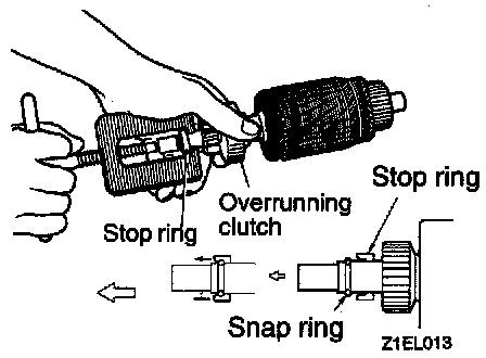 Using a suitable pulling tool, pull overrunning clutch stop ring over snap ring.