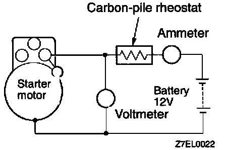 2. Connect a test ammeter (100-Ampere scale) and carbon pile rheostat in series with battery positive post and starter motor terminal.