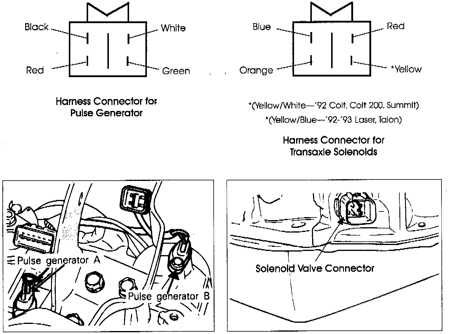 This condition may be caused by plugging the pulse generator connector into the solenoid harness and the shift solenoid connector into the pulse generator harness. Use the figures to correctly identify the harness connectors and locations.