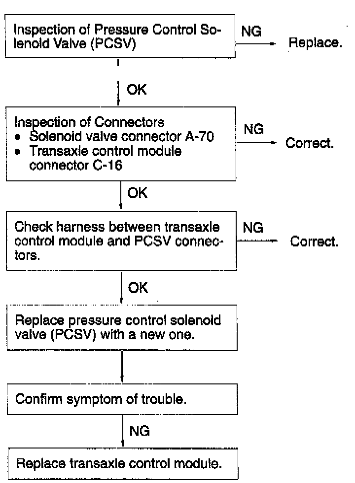 If the pressure control solenoid valve shows a high resistance value, code No. 45 is output to indicate that the pressure control solenoid valve is open-circuited. If it shows a low resistance value, code No. 46 is output to indicate that the pressure control solenoid valve is short-circuited. If control No. 45 or 46 is output four times, fail safe code No. 85 is output to indicate that pressure control solenoid valve has been open- or short-circuited and this activates the fail safe function to lock transaxle at the 3rd speed (D) or 2nd speed (2, L).