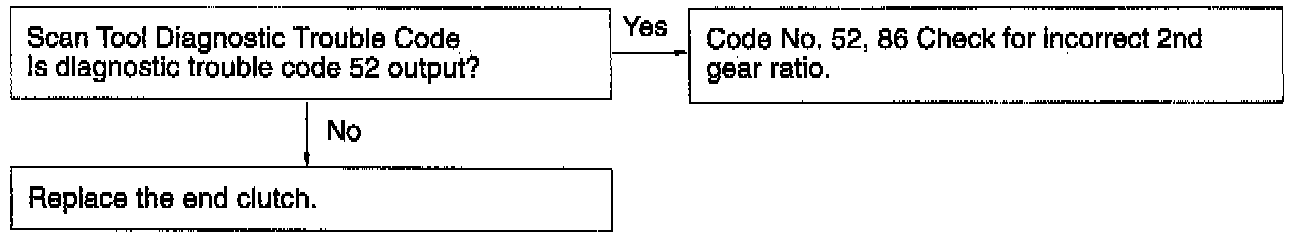 After a shift to the 4th speed has been completed, if the value of the PG-A output (input shaft speed) divided by the 4th gear ratio does not coincide with the PG-B output (output shaft speed), code No. 54 is output. If associated diagnostic trouble code (No. 51, 52, 53, 54) is output four times, fail safe code No. 86 is output to indicate that the 4th gear ratio is incorrect and this activates the fail safe function to lock transaxle at the 3rd speed (D) or 2nd speed (2, L).