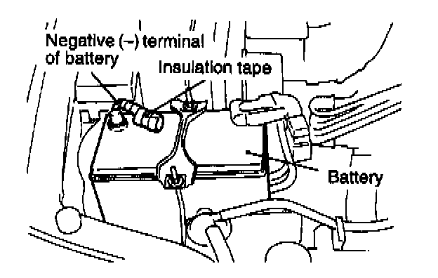 1. After the ignition switch has been placed at the LOCK position and the negative (-) terminal of the battery has been disconnected, wait for more than 60 seconds before starting work. Wind a tape around the disconnected (-) terminal for insulation.