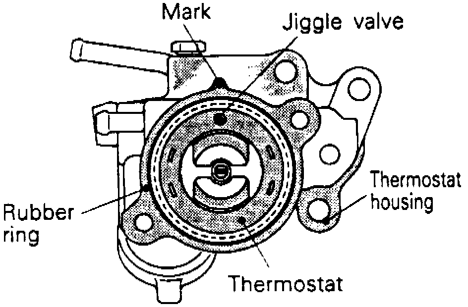 4. Reverse procedure to install, ensure jiggle valve on thermostat is aligned with mark on thermostat housing.