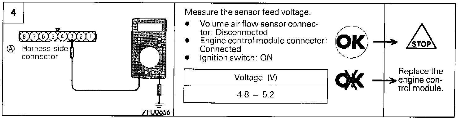 Hint 2: If the volume air flow sensor output frequency is other than 0 when the ignition switch is turned ON (but not starting the engine), faulty volume air flow sensor or engine control module is suspected.