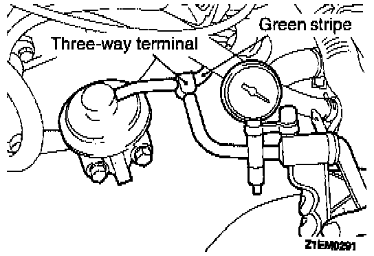 1. Disconnect the vacuum hose (green striped) from the exhaust gas recirculation (EGR) valve, and then connect a hand vacuum pump via the three-way terminal.
