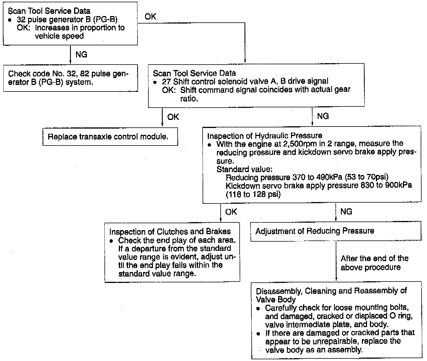 Deviations occur at all shift points during operation. In this case, a defective pulse generator B (PG-B), shift control solenoid valves A, B (SCSV-A, -B), etc. are suspected.