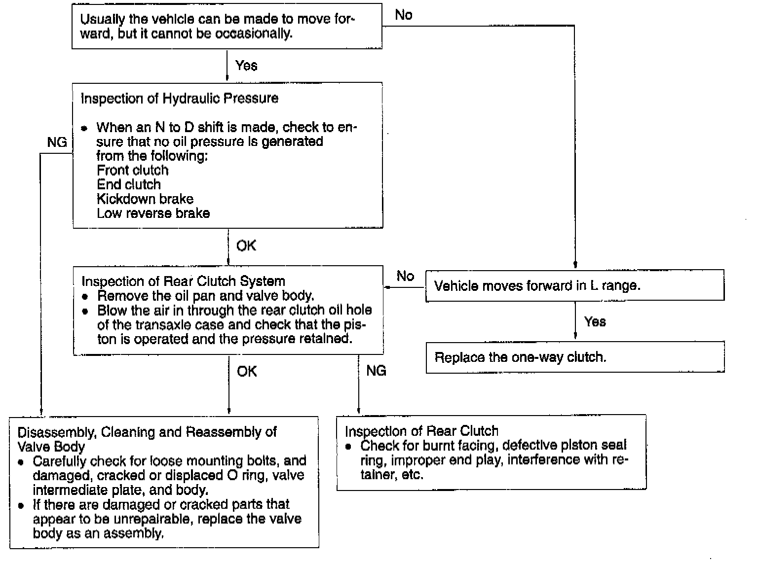 With the engine at idle, you cannot make the vehicle move forward by changing the selector lever position from N to D, 2 or L. In this case, an abnormal line pressure or a defective rear clutch, one-way clutch, etc. is suspected.