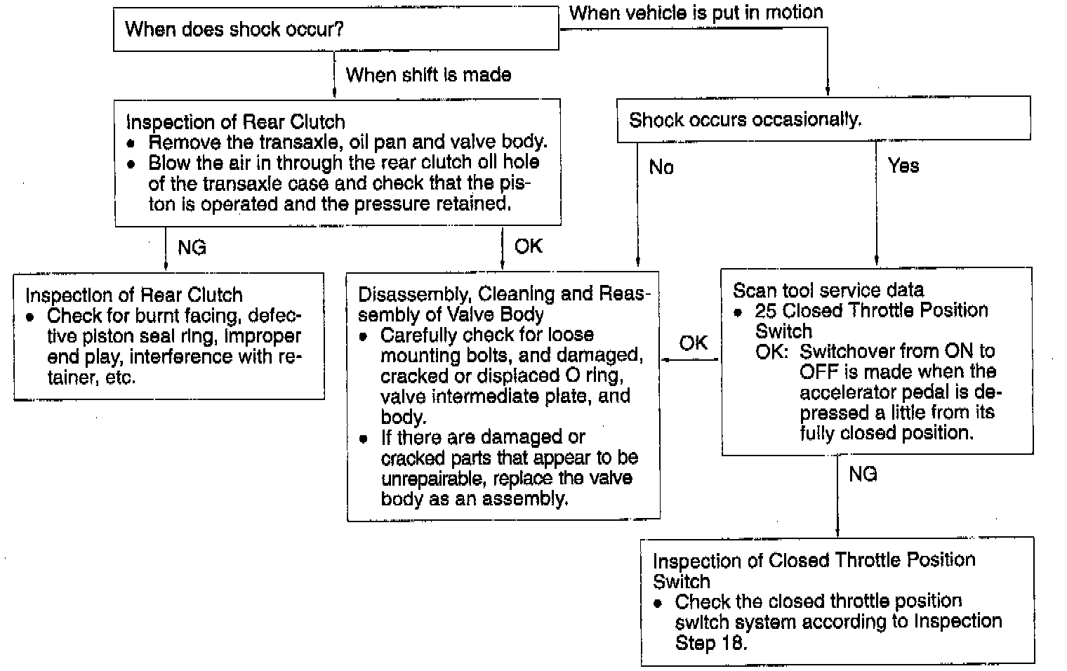 When the selector lever position is changed for a shift from N to D with the engine at idle, excessive shock or time lag of 2 secs. or more occurs. In this case, a defective rear clutch, valve body, etc. are suspected.
