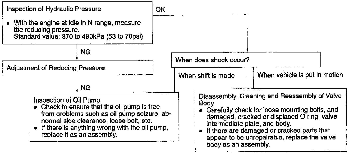 When the selector lever position is changed for a shift from N to D and also from N to R with the engine at idle, excessive shock or time lag of 2 secs. or more occurs. In this case, an abnormal reducing pressure, or a defective oil pump, etc. are suspected.